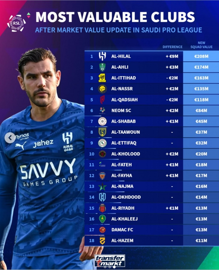 4、利雅得胜利(+200万欧):1.35亿欧