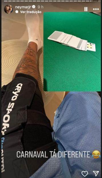 对布拉甘蒂诺红牛战后,内马尔在社交媒体上发文安慰球迷:“我好着呢。当时我感觉有点不舒服,我认为最好保护一下自己!我已经有很长时间没以这样的强度打比赛了。”可3月2日打完比赛,内马尔就跟朋友们玩起了扑克牌,一直玩到3月3日凌晨。在社交媒体上,内马尔发文:“(今年)狂欢节不同。”玩扑克牌,内马尔的理由是“庆祝我们桑托斯晋级”。